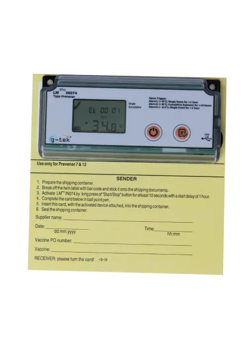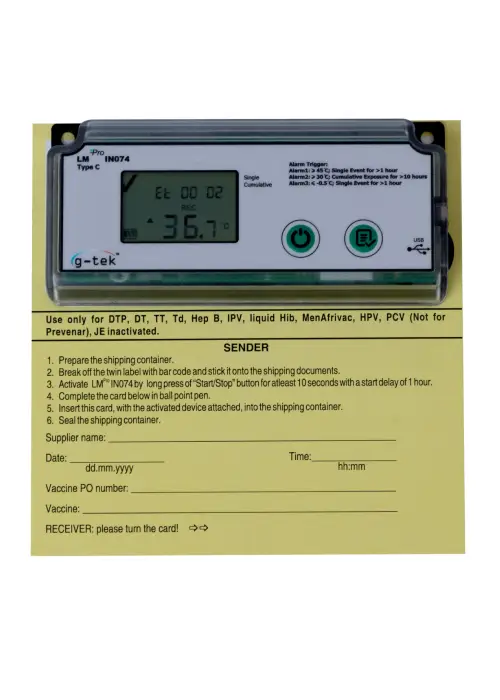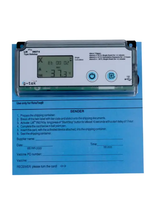 The LM Pro IN074 series are single use, cost effective and reliable 40 days Electronic Shipping Indicator in support of vaccine procurement and transport requirement. It shows if a vaccine is exposed to time-temperature limits beyond stipulated by WHO/PQS/E06/TR07.4. There are four models to choose from, based on the vaccines being transported – Type Prevenar, Type Rotateq, Type A/B and Type C.